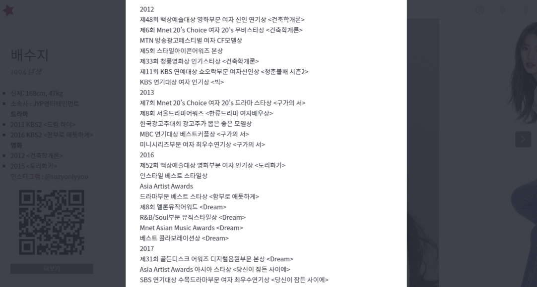 기존에 횡스크롤타입 프로필 페이지의 경우, 구조상 프로필 정보를 입력하는 영역이 작아서 내용을 길게 쓰면 보이지 않게 됩니다. 이를 위해서 더보기 버튼을 누르면 팝업창으로 자세한 내용을 볼 수 있도록 했습니다. 작성시 더보기 태그를 삽입하고 그 아래에 팝업창에 들어갈 내용을 쓰시면 됩니다.